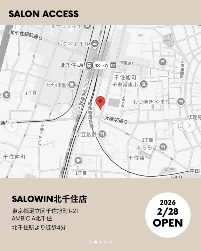 アクセス アクセス、店舗の情報はこちらになります。 SALOWIN 北千住 〒120-0026 東京都足立区千住旭町1-21 AMBICIA 北千住1F 10:00〜20:30 定休日 火曜日 〒 120-0034 東京都足立区千住1-35-3サンライズ千住1F OPEN 10:00~21:00 CLOSE 火曜・その他不定休 時間外におきましてはご相談下さい。 ※現在フリーランスとして活動していますので、メニュー・料金など所属店舗とは異なります。 また、問い合わせなどのご連絡も店舗では対応しかねます。キムラ個人の公式LINE、メール等をご利用下さい。